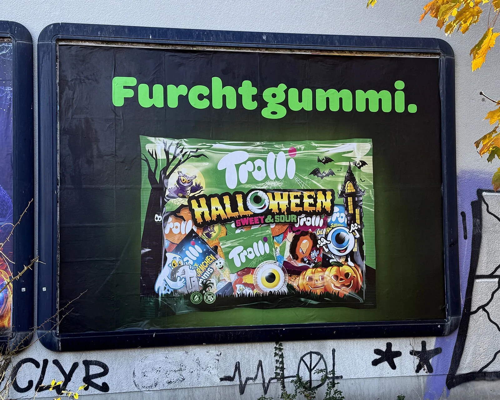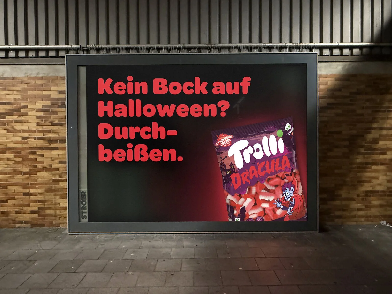 In der aktuellen Kampagne verwandelt sich Fruchtgummi in „Furchtgummi“. Trolli positioniert Halloween als Event für alle Altersgruppen – mit auffälligen Farben, pointierten Headlines und dem typischen Trolli-Humor. Im Fokus stehen Produkte wie Tarantula, Super Brain und die Glotzer, inszeniert über digitale Kanäle, (D)OOH und Social Media. Highlight ist eine „Jump Scare“-Aktion in Berliner Unterführungen mit überdimensionalen, animierten Glotzern samt Soundeffekten.